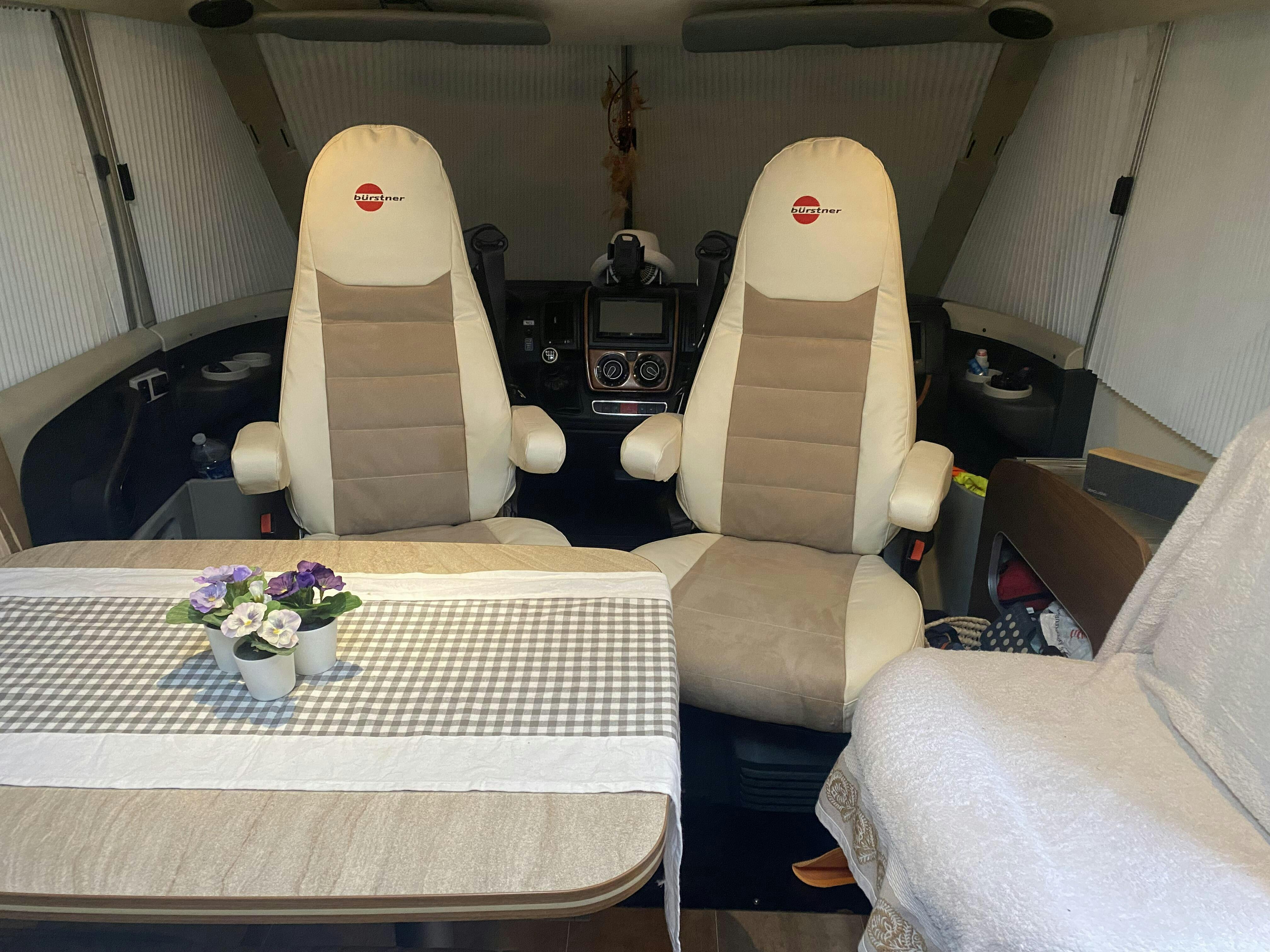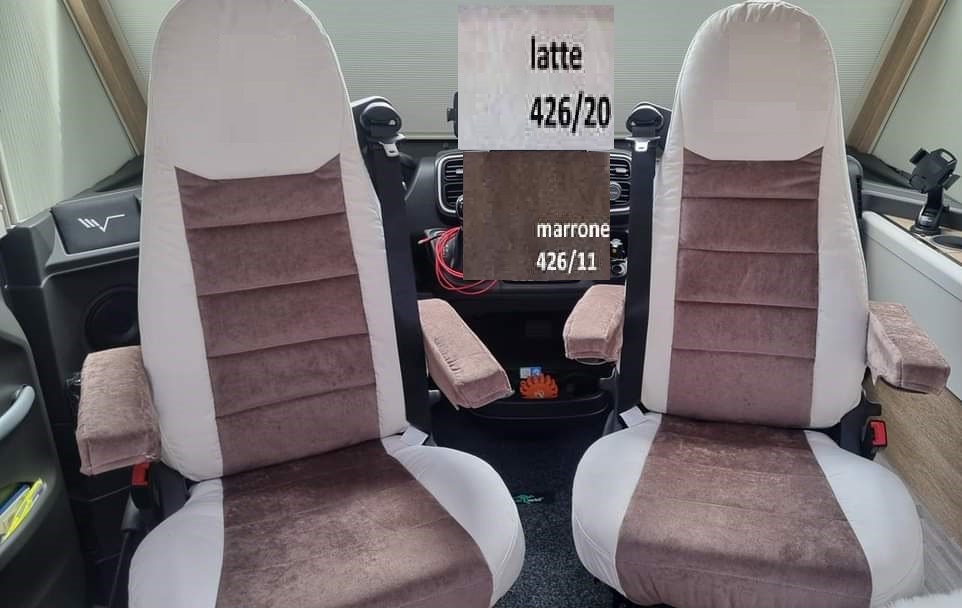Pair of 2 padded covers for driver's seats model AGUTI with belts two-color fabric milk and brown handcrafted, stain-resistant, machine washable at 40 degrees, easy to apply in DIY, by sending an email indicating the order number you can request an embroidered logo or customize the colors of your purchase.